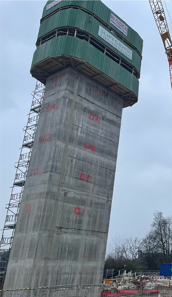 The works have been sequenced to deliver two slipformed cores consecutively throughout the duration of the project. This approach has established a rolling cycle, ensuring continuous utilisation of slipform rigs, labour and supervision, while maintaining steady vertical progression across the site.